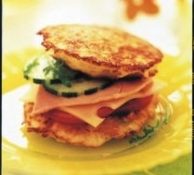 4-Disposez les galettes sur du papier absorbant, puis montez les petits hamburgers en plaçant successivement 1 galette de pomme de terre, 1/4 de tranche de jambon blanc, 1 rondelle de tomate, 1 rondelle de concombre, 1 de salade, 1 tranche d'emmental et pour finir une autrs galettes de pommes de terre.