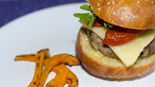 Disposer une tranche de boeuf, une tranche de Comté, 3 pétales de tomates, deux tranches de Coppa grillée, quatre feuilles de roquette; couvrir et servir avec avec les frites de patates douces.