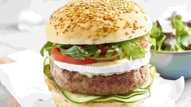 Monter les hamburgers dans cet ordre : pain, compoté d’oignons, courgette, steak haché, camembert, tomate, roquette et pain.