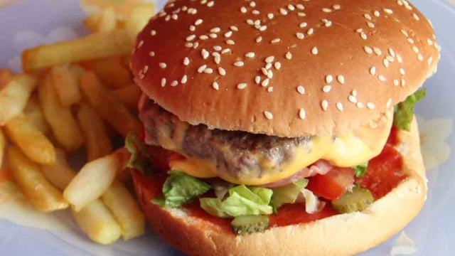 Coupez les pains en deux et faites-les toaster au four. Garnissez une moitié de pain de ketchup. Placez la viande chaude surmontée du fromage et continuez à superposer les ingrédients : un peu d'oignons frits, 2 tranches de tomates, de la laitue, 2 ou 3 tranches de cornichons, le bacon. Tapissez la seconde moitié du petit pain de mélange ketchup et moutarde et refermez votre hamburger. Dégustez sans tarder.