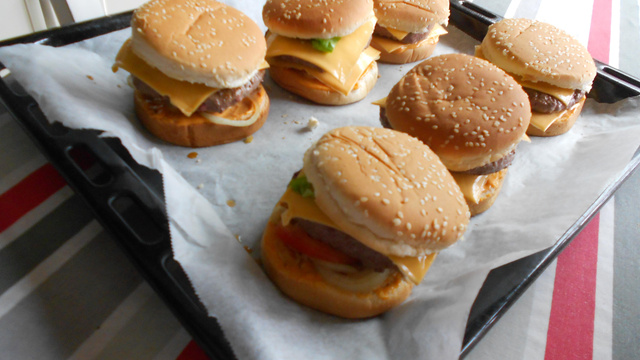 Faire revenir dans une petite poêle l'oignon émincé et mettre le sur la partie basse du pain à hamburger. Ensuite, disposer une tranche de fromage puis le steack précuit dans une poêle avec un filet d'huile d'olive, un peu de sel et de poivre, une autre tranche de fromage, la tomate. Saler, poivrer et ajouter la salade. Refermer l'hamburger.