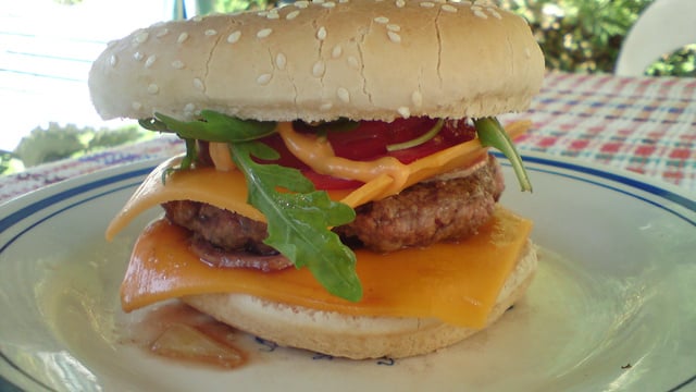Une fois les steaks cuits, monter les hamburger. Pain à hamburger, sauce, oignons, 1 tranche de bacon, 1 tranche de fromage, steak, 1 tranche de bacon et 1 tranche de fromage. 1 tranche de tomate, quelques feuilles de salade. Un peu de sauce à nouveau et terminer par la partie haute du pain