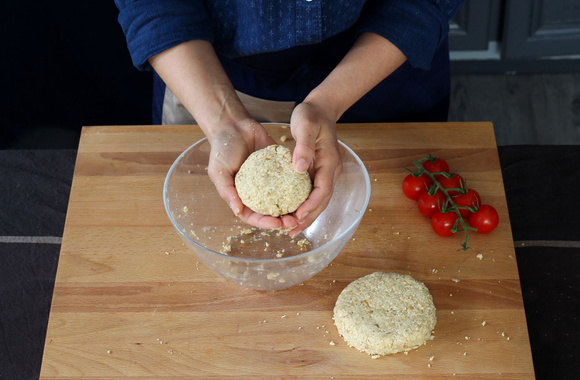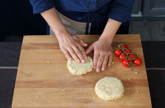 4Puis en les aplatissant afin d'obtenir les galettes qui ont une forme de steack haché.