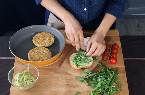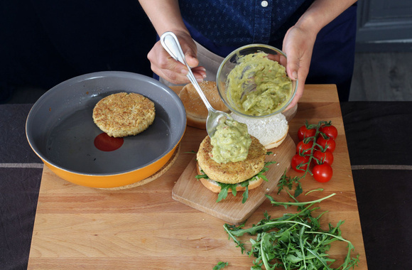 9Couvrez avec le chapeau du pain et procédez de la même manière pour former les autres burgers.