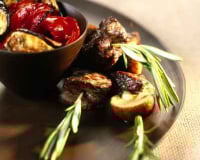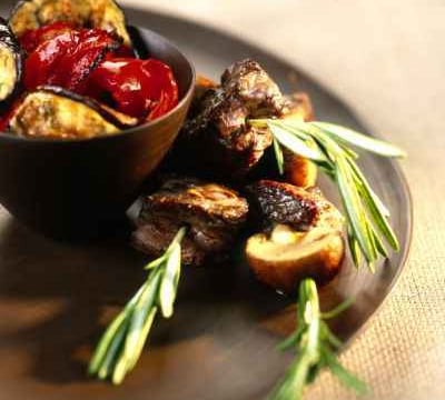 - 4Sur chaque assiette, dresser deux brochettes et les accompagner des légumes grillés.