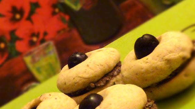 Remplir de pâte une poche à douille et former des petits ronds sur une plaque à pâtisserie. Décorer les d'une demi-olive. Enfourner pour une dizaine de minutes puis les laisser refroidir et sécher sur une grille une quinzaine de minutes.