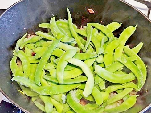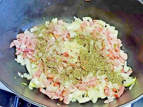 2Ajouter les lardons et les épices, mélanger. Ajouter les haricots congelés, couvrir la cocotte et laisser cuire à couvert à feu doux pendant 1h.