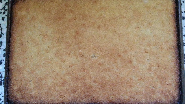 Saupoudrer le mélange étalé avec des amandes moulues (mettre 1 mesure d'amandes moulues avec 1/2 de mesure de sucre (bien mélanger les deux) légèrement humidifié avec l'eau de pleur d'oranger)