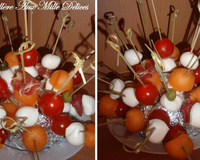Vous pouvez utiliser d'autres supports tels qu"une pomme, une pastèque ou un pamplemousse... Les brochettes peuvent être agrémentées selon vos envies et selon la saison : concombre, champignons, radis, raisins... A décliner à l'infini...