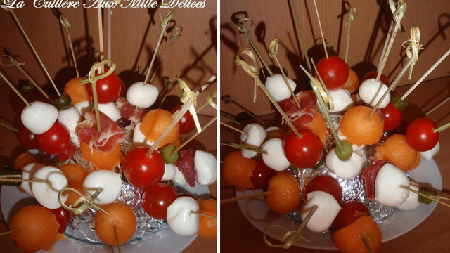 Enfiler sur les brochettes les associations d'ingrédients désirées : melon, jambon ; tomate, mozzarella ... et les piquer dans le support.