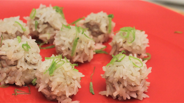 Bien égouttez le riz gluant trempé et étalez les dans une assiette. Prenez une cuillerée de viande, mettez la dans la paume pour former une boulette, puis faites rouler la boulette sur le riz blanc et noir (on peut aussi mélanger une partie de ces deux riz). On peut faire environ 16 boulettes avec la quantité de viande indiquée.