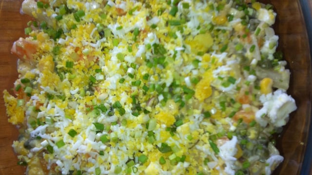 Pommes de terre, carottes, haricots verts et courgettes coupés en cubes et cuits à l'eau. Ajouter ensuite le maïs, des oeufs durs, de la mayonnaise, sel et poivre.