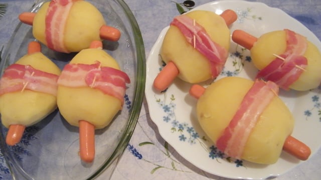 Épluchez les pommes de terre. A l'aide d'un vide-pomme, creusez un 'tunnel' assez large, dans la longueur de la pomme de terre pour pouvoir y glisser, plus tard,une saucisse.