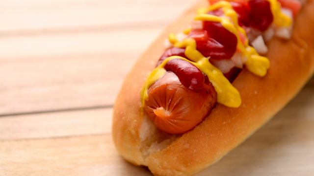 Badigeonner ces rectangles de moutarde et les rouler afin de leur donner la forme du hotdog.