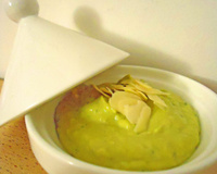 Dans un blender, mixer les petits pois égouttés avec l'ail pressé, la purée d'amande, le jus de citron, l'huile d'olive et la crème soja.
