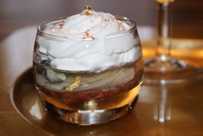 Verrine d'huitres en gelée sur lit de vinaigre à l'échalote, et crème fouettée au piment d'Espelette.