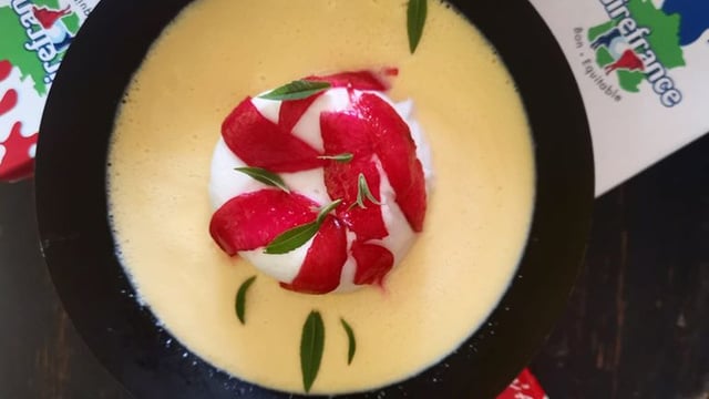 Répartissez la crème anglaise dans de jolies assiette, posez dessus la meringue et ajoutez les lamelles de pêches et des feuilles de verveine.