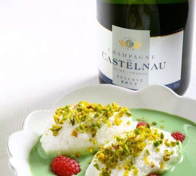 Formez des quenelles avec deux cuillères et faites-les pocher dans l'eau frémissante quelques instants sur chaque face. Dressez la crème anglaise froide dans quatre coupelles, répartissez les quenelles de blancs d'œufs et saupoudrez-les de pistaches hachées. Déposez des framboises tout autour et dégustez.