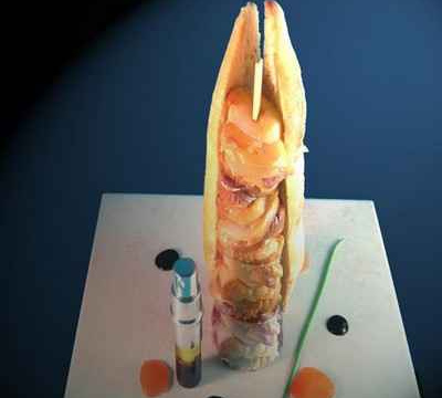 - 2Dressage :Réchauffer le kebab au four à 120°, ce plat doit être servi tiède car les st jacques serait trop cuite et un peu séches.Mettre dans le sray un peu de reste de marinade et le placer sur assiette.Pour bien déguster le plat asperger le pain et les saint jacques et croquer.