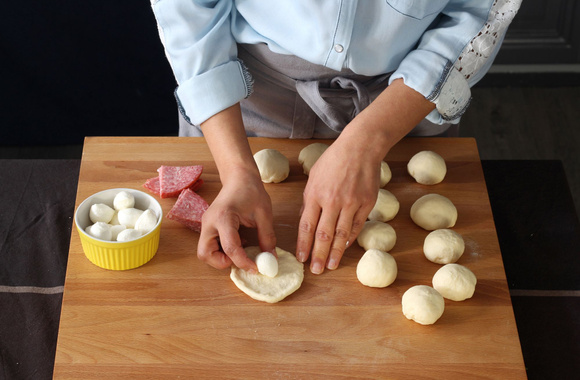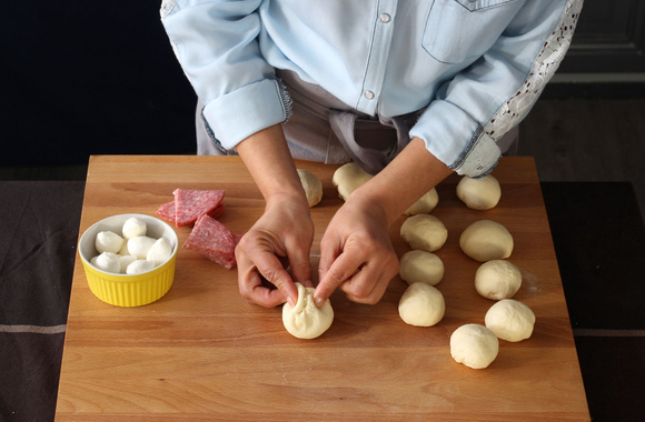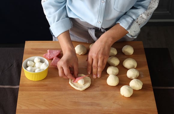 6Ramenez les bords de la pâte au milieu pour enfermer la farce, puis façonnez une boule.