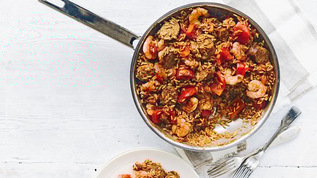 Avec le Jambalaya, vous allez voyager en Louisiane ! De fait, souvent servi en Nouvelle-Orléans, ce plat de la cuisine cajun remporte un franc succès. Pour ce faire, vous avez besoin d'une sauteuse dans laquelle vous allez faire revenir des ingrédients terre / mer tels que des crevettes, du jambon cuit, des rondelles d'andouille, de saucisses fumées et de chorizo épicé. Question assaisonnement, en plus des 10 gouttes de tabasco et du bouillon de vollaile, un subtil mélange d'oignon, de clous de girofle, d'ail, de coriandre, de persil, de thym, de piment de Cayenne, de poivre vert, de laurier, va venir parfumer et relever le goût de votre Jambalaya. Enfin, de la tomate et de l'oignon va donner des couleurs et de la saveur à votre Jambalaya. En somme, avec cette recette de Jambalaya, vous allez bluffer vos invités !