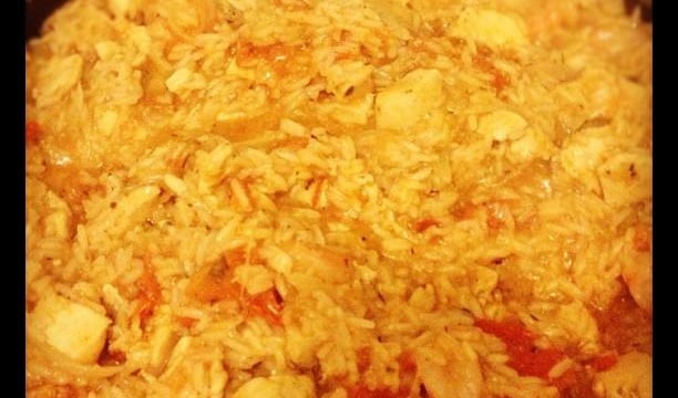 Y ajouter les dès de tomates et le riz. Lorsque le riz devient translucide, y ajouter les épices, et peu à peu, le bouillon de poule (louche par louche, on en rajoute une lorsque toute la précédente a été absorbée).