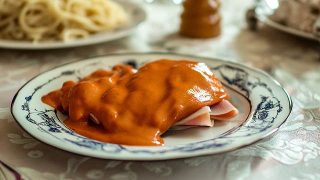 Verser la sauce chaude dessus, et réserver à four tiède. Attention trop longtemps ferait sécher la sauce dessus et le jambon donnerai de l'eau.