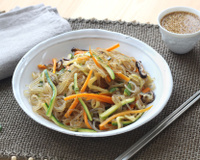 Il s'agit d'un plat typique coréen préparé avec des nouilles de fécule de patate douce appelées Dangmyeon. C'est un plat familial servi en période de fêtes. Ces nouilles ont la particularité d'être translucides et sans gluten.