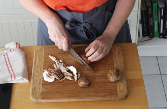 3Retirez le pied un peu dur des shitakés, essuyez-avec un torchon humide puis coupez-les en tranches. .