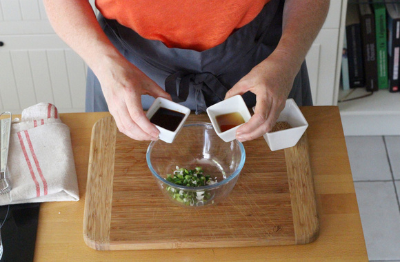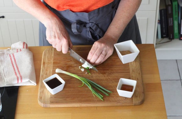 4Ciselez les ciboules (la partie blanche et les 3/4 du vert). Réservez 2 cuillères à soupe pour la sauce.