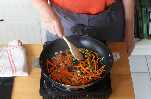 Ajoutez les carottes et la ciboule puis faites-les revenir pendant 2 minutes en mélangeant très souvent. Quand les carottes commencent à s’assouplir, versez le contenu de la poêle dans un bol.
