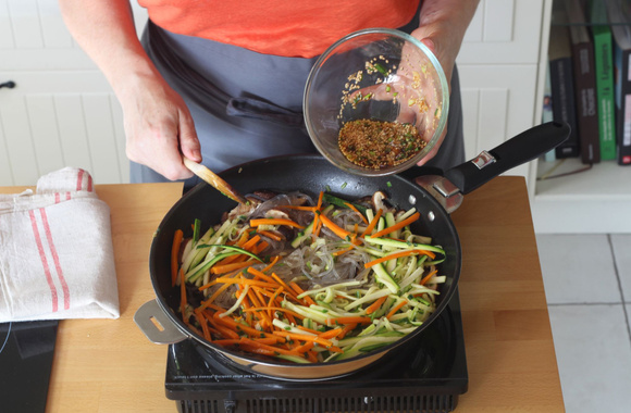 Plongez les nouilles de fécule de patate douce (celles que l'on voit sur la photo) dans de l’eau bouillante puis faites les cuire pendant 6 à 7 minutes. Elles doivent être tendres. Rincez-les sous l’eau froide et réservez.