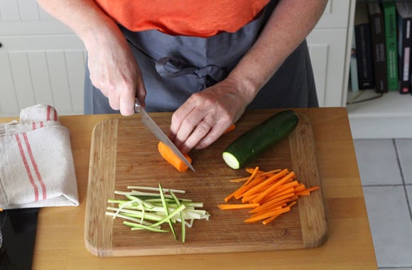 2Pelez la carotte puis détaillez-la en julienne. Faites de même avec la courgette, sans la peler.