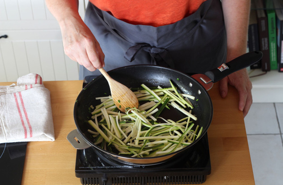 7Ajoutez un peu d’huile dans la poêle, ajoutez les courgettes et faites-les revenir pendant 30 secondes. Versez dans le bol.