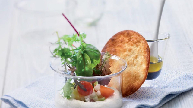 Une salade de légumes en verrine accompagnée d'une tuile croustillante !