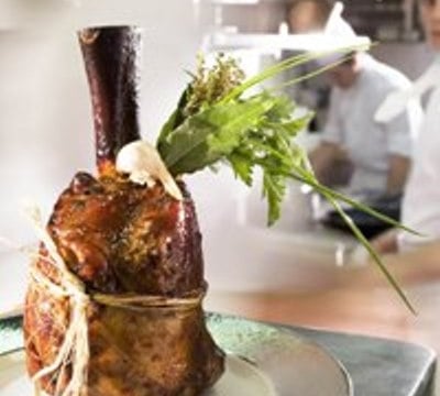 Déposez le jarret dans un plat à la sortie du four. - 7Passez le jus au travers d'une passette.