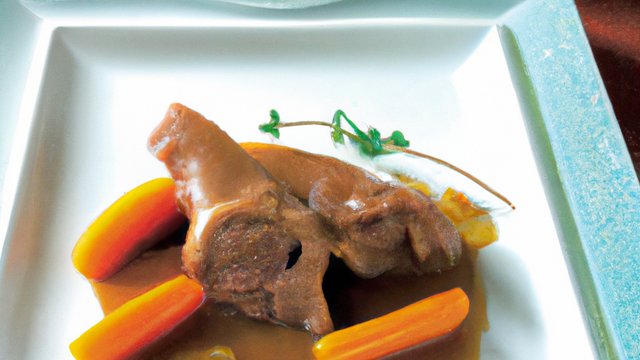Servir dans un plat les pommes de terre, le jarret debout sur les pommes de terre arrosé du jus.