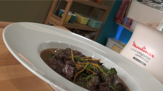 Ajoutez les légumes, refermez le couvercle et poursuivez la cuisson 10 minutes. Ajoutez la farine et le vin rouge, le bouillon, la feuille de laurier, le thym et du poivre et un peu de sel. Ajoutez l'écorce d'orange. Fermez le couvercle et réglez sur le programme "mijotage", vitesse 2 pendant 1h15. Retirez le mélangeur et disposez dans le plat de servir.