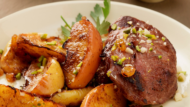 Servir les joues de porc avec les pommes sautées, le tout saupoudré des graines légèrement concassées.