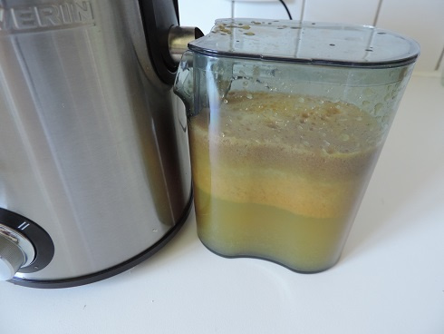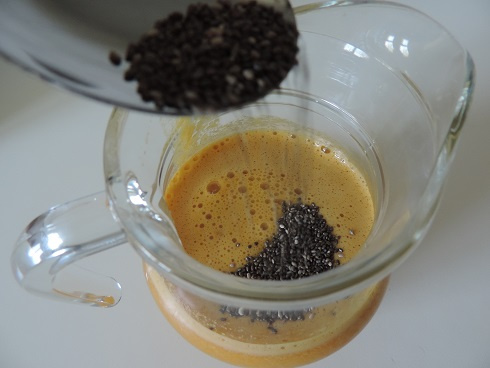 2Transférer le jus dans un pichet (grâce au bec verseur de mon extracteur, celui-ci garde la mousse). Verser les graines de chia dans un petit récipient et ajouter l'équivalent d'un verre de jus. Bien mélanger à plusieurs reprises, le temps de faire gonfler les graines. Incorporer la préparation dans le reste de jus.