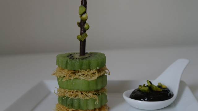 Le montage se fait peu de temps avant de servir pour éviter que la pâte à kadaîf perde de son croustillant et directement sur l'assiette de service. Empiler délicatement les ronds de kadaïf et les kiwis sur 3 étages puis raccourcir le mikado de la partie du bas non chocolatée. Enfiler très précautionneusement le mikado à travers les différents étages. C'est assez facile si les trous sont bien faits.