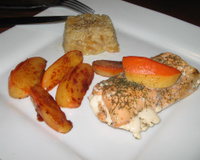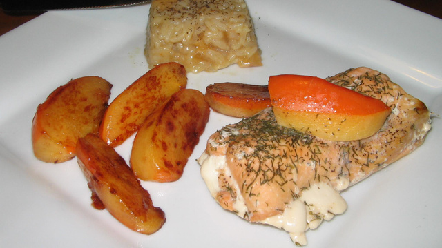 Servir une portion de risotto aux kakis avec un pavé de saumon et la moitié des quartiers de kaki rôtis.
