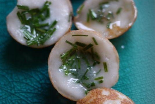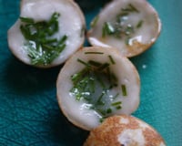 La confection des Kanom krok nécessite l"utilisation d"une poêle spéciale alvéolée en fonte d"aluminium. L"idéal est de cuire sur du gaz. Cette poêle est disponible dans les épiceries asiatiques bien achalandées ou sur internet. A défaut, utilisez une pôele à blinis aux bords suffisamment profonds.