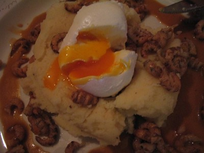 Mettez la purée au centre de l'assiette avec une poche à douille. Essayez de former un nid d'oiseau avec. Versez le beurre noisette dans le trou central, rajoutez par-dessus la 1/2 des crevettes grises (à t° ambiante) et déposez un œuf mollet au-dessus.