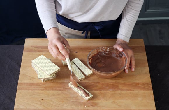3Badigeonnez légèrement le dessus d'une gaufrette au chocolat.