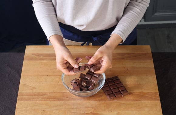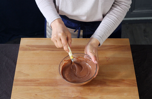 1Coupez le chocolat au lait en morceaux, faites-les fondre au bain-marie.