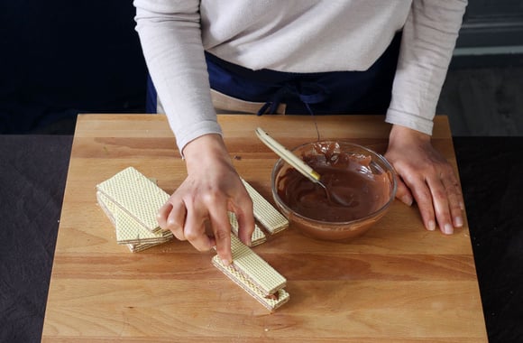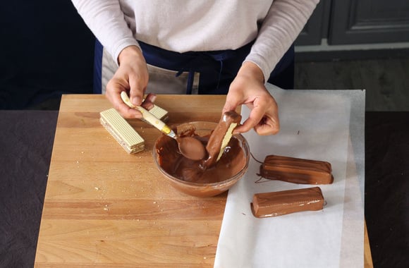 5Laissez durcir puis plongez entièrement la double gaufrette obtenue dans le chocolat fondu.