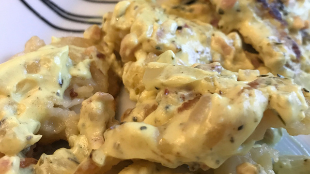 Une fois tous les knepfles cuites, les faire poêler dans du beurre… sur la photo, nous avons ajouter de la crème, des lardons, des oignons et un peu de curry et il s’agissait par conséquent du plat principal !