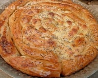 Voici celle que j'ai faite en version salée, après avoir vu un documentaire où une paysanne Bulgare étalait sa pate si finement, qu'elle en recouvrait presque toute sa grande table et sa toile cirée, avant d'y rouler un mélange à la feta dedans et de la cuire, en forme d'escargot, dans un immense moule à tarte.