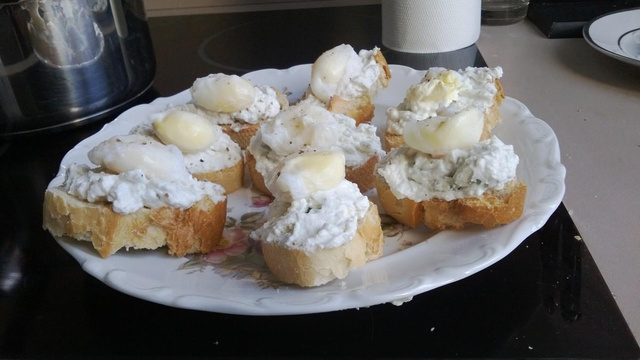 Etaler la préparation sur les tranches de pain aux noix puis y ajouter l'oeuf. Poivrer.